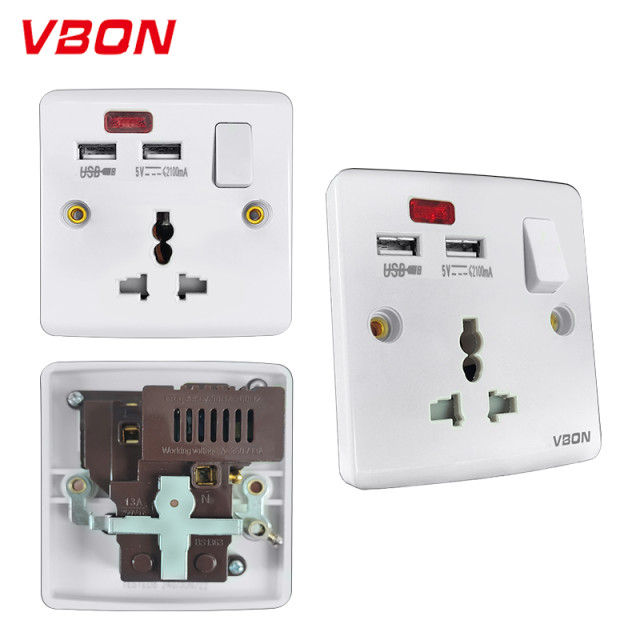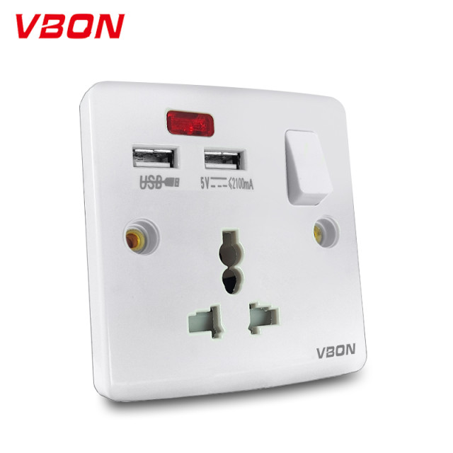 A71-10 16A 3 pin universal switched socket + 2 USB with neon